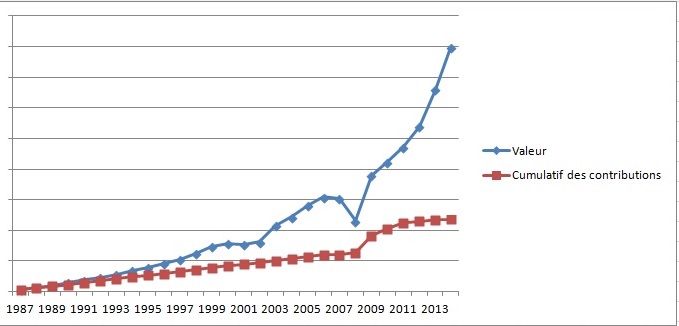 Le point que je veux faire aujourd’hui est l’importance de contribuer à l’épargne à long terme régulièrement et longtemps. Le graphe qui suit vous montre ma situation après 27 ans d`épargne. Plus précisément, la ligne rouge montre le cumulatif de mes contributions à mes épargnes REÉR. La ligne bleue montre la valeur de mes épargnes REÉR.